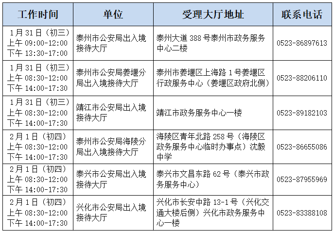 为方便群众在春节假期办理出入境证件,全市公安出入境接待大厅将在1月31日、2月1日两天时间错时开放,受理护照、港澳通行证及签注、大陆居民往来台湾通行证及签注申请。请广大申请人知悉,合理安排办证时间,如有紧急办证等需求可拨打各地窗口服务热线咨询,我们将全力为您提供出入境服务保障!祝您和家人春节快乐,阖家幸福!